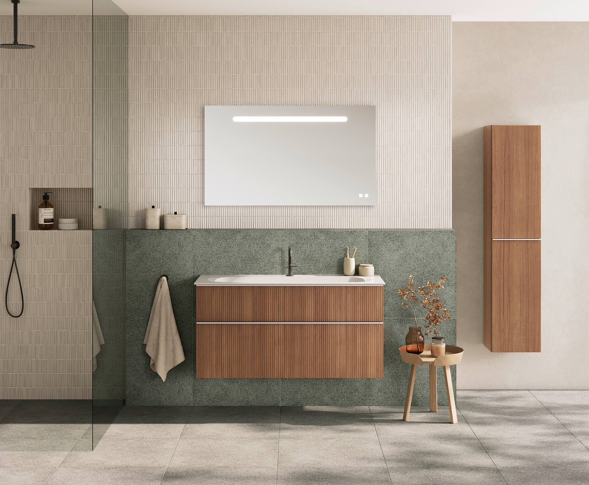 Fiumo 2.0 umfasst zudem eine Gästebadlösung mit 470 mm breiter Waschtischkombination und seitlicher Hahnlochbank sowie einem passenden rechteckigen Wandspiegel mit vertikaler LED-Beleuchtung – inklusive Spiegelheizung und Sensorschalter. Damit wird Fiumo 2.0 zum Komplettangebot für eleganten Lifestyle im Badezimmer.